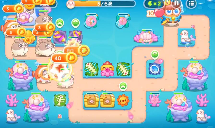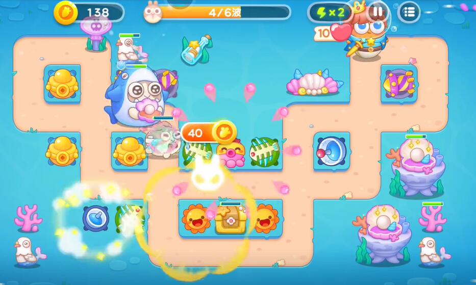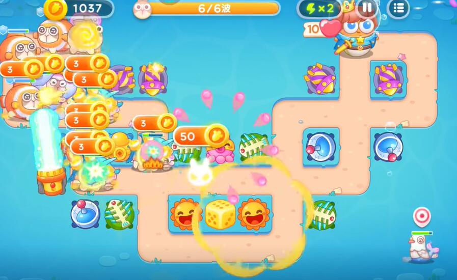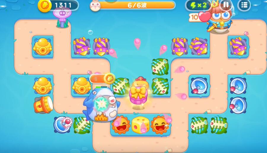 2、摧毁宝箱得到一个章鱼,对其升级来帮助我们守家,在章鱼左侧再建造一个鱼骨来攻击左侧的障碍物。