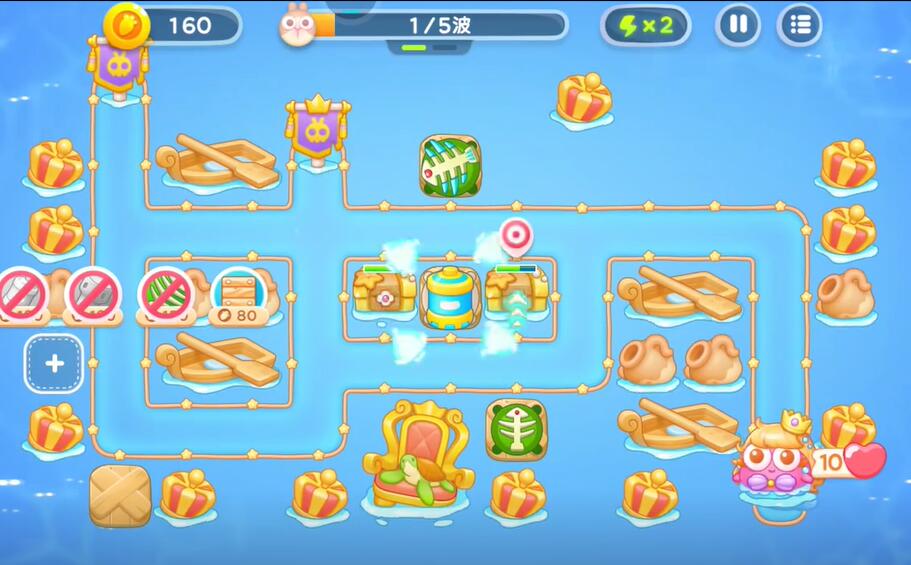 5、在中央的偏左下方建造一个双向塔攻击下方的障碍物,右侧建造两个乌龟塔对这里的兔子进行输出。