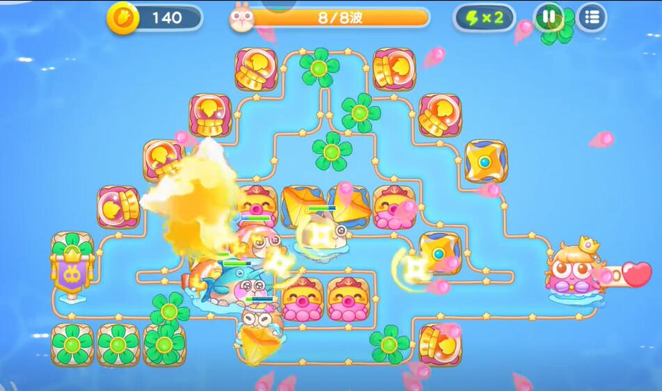 2、在左上部分建造一个喷火器对兔子进行补充伤害,同时摧毁宝箱得到一个章鱼,对周围的障碍物进行输出。