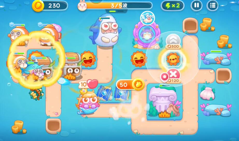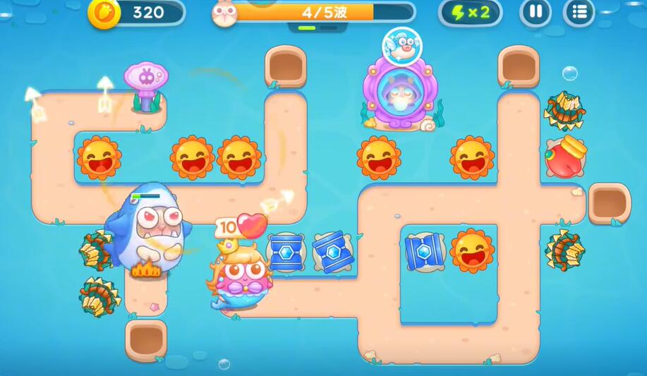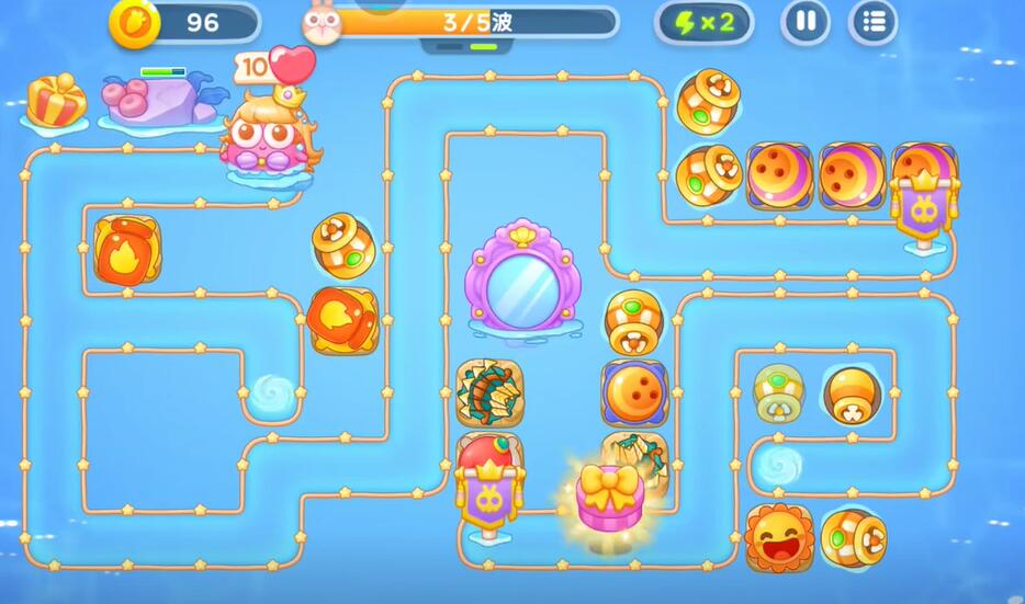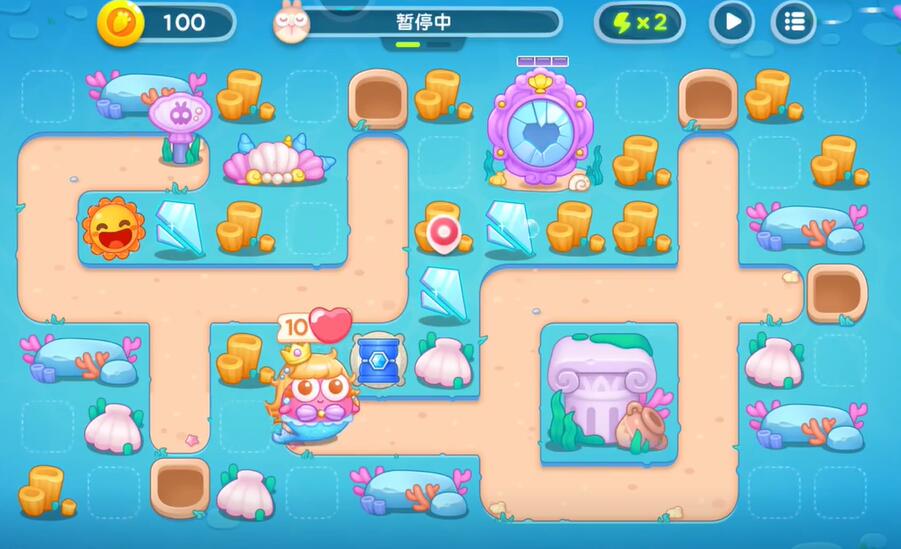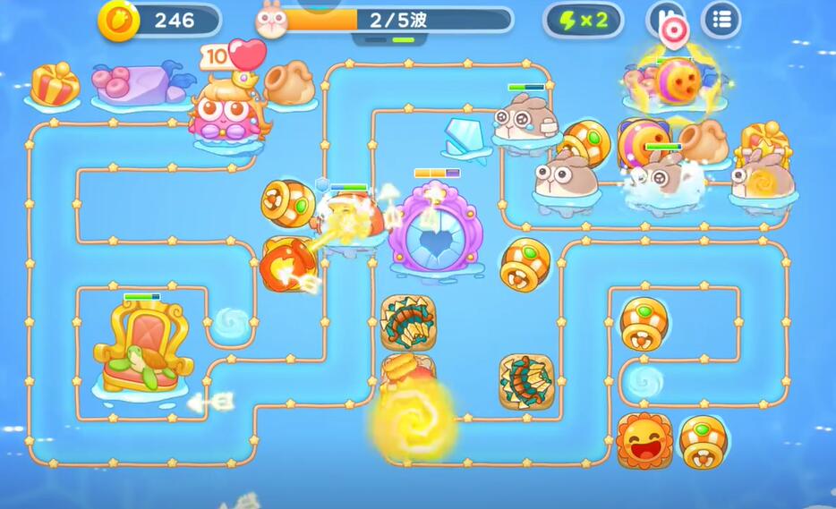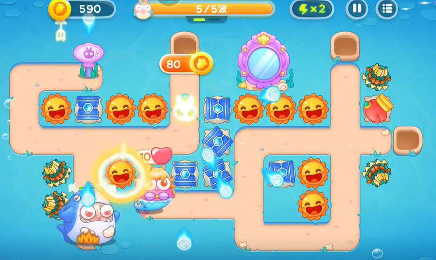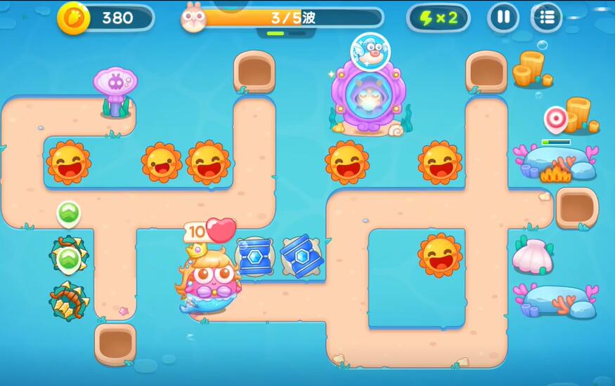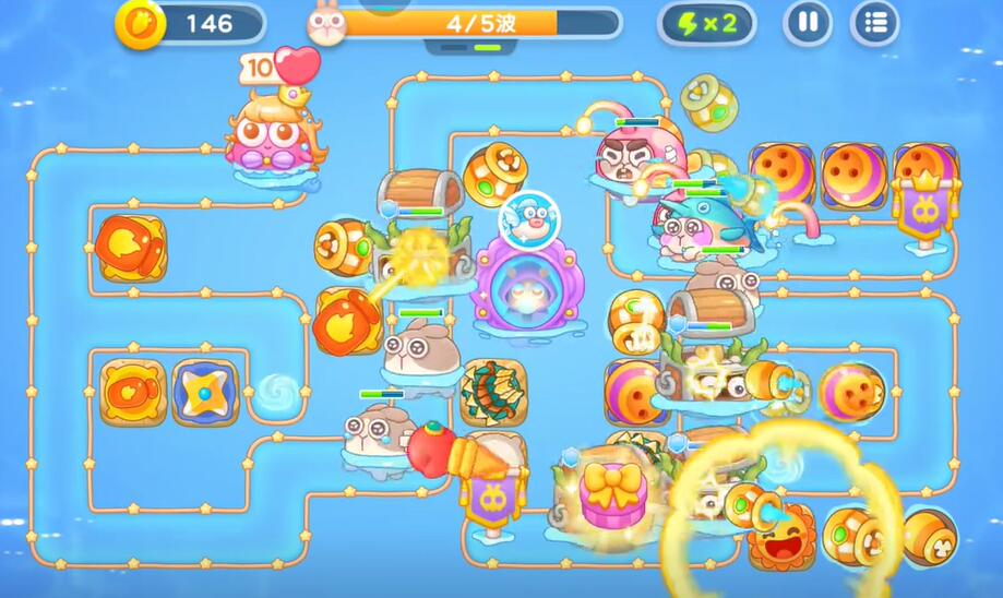 1、在右侧出怪口的转角处上方和下方各建造一个鱼雷,对水中的兔子进行输出,搭配其他的防御塔清理兔子。