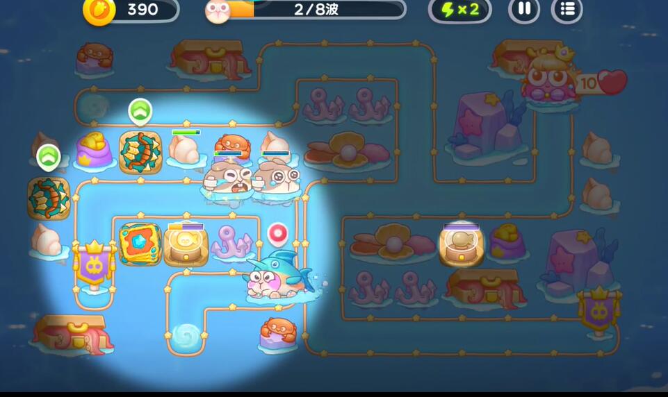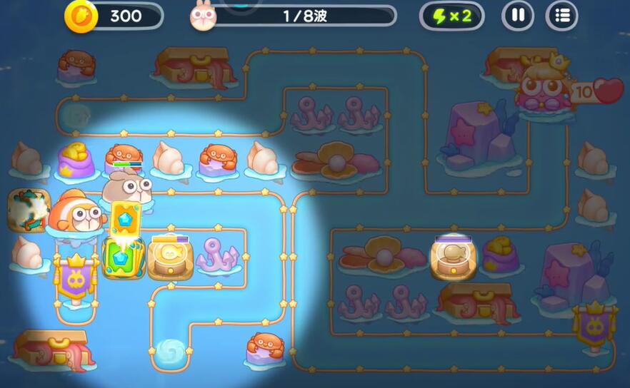 6、左侧出怪口多重箭的下方建造一个手电筒对兔子进行输出,右侧建造两个鱼雷来应对隐藏在水下的兔子。