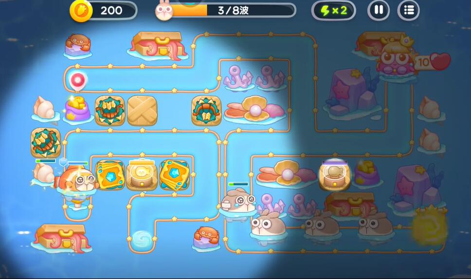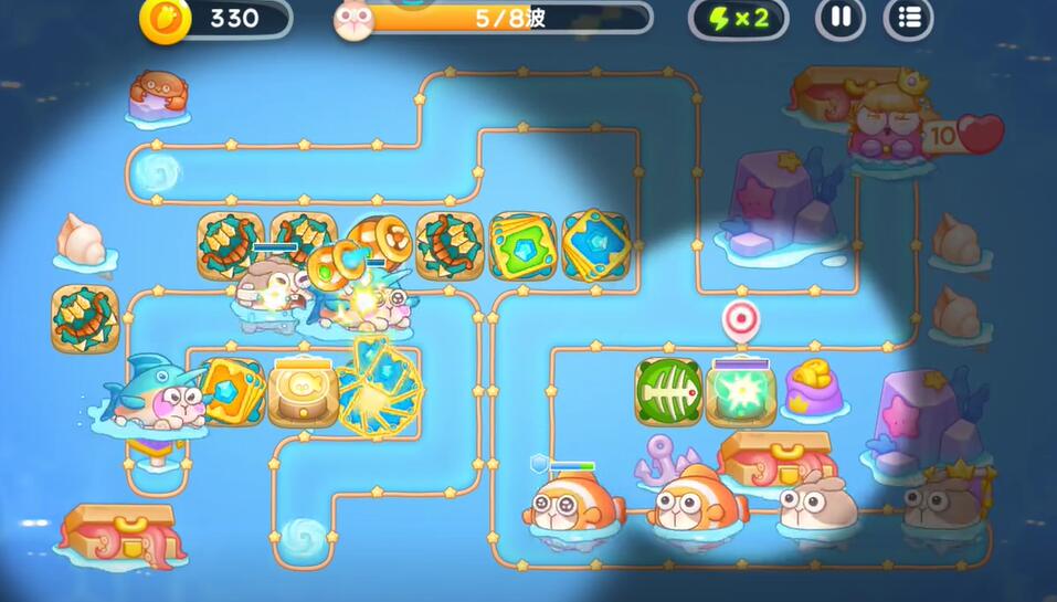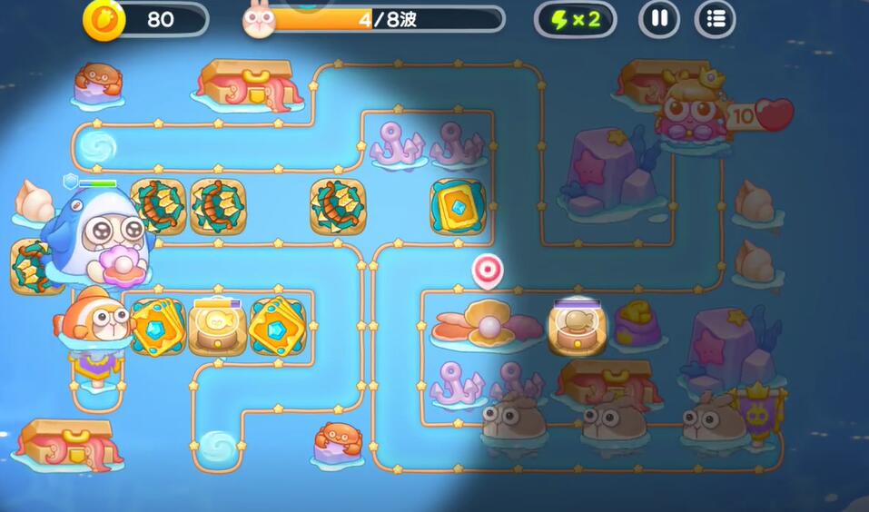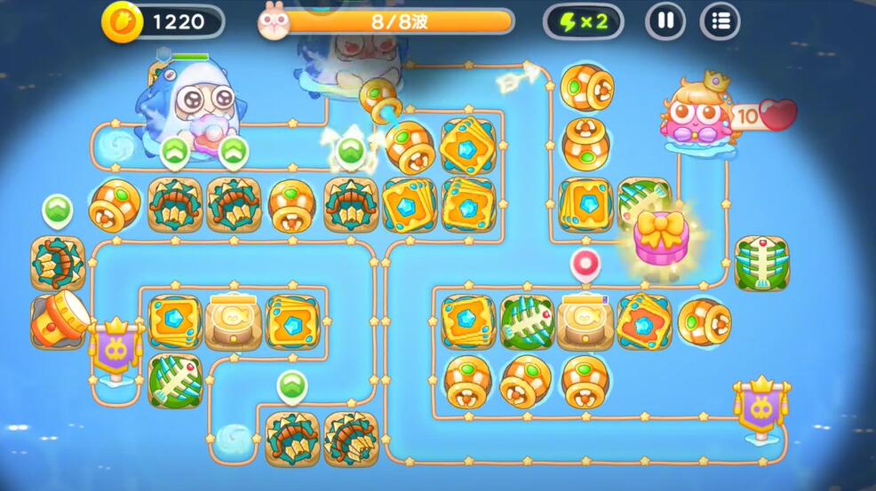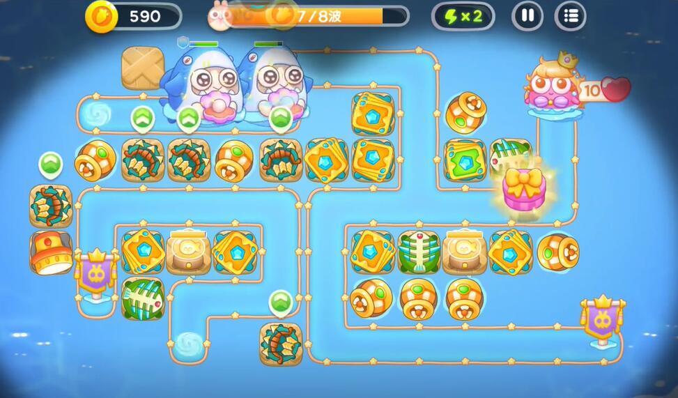 5、在中间的偏左侧补充一个鱼雷塔,中间补充一个卡牌塔,右下角建造鱼骨塔,对右侧的兔子进行攻击。