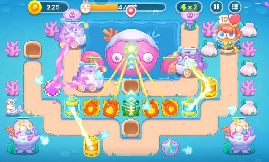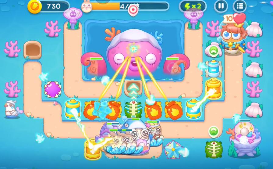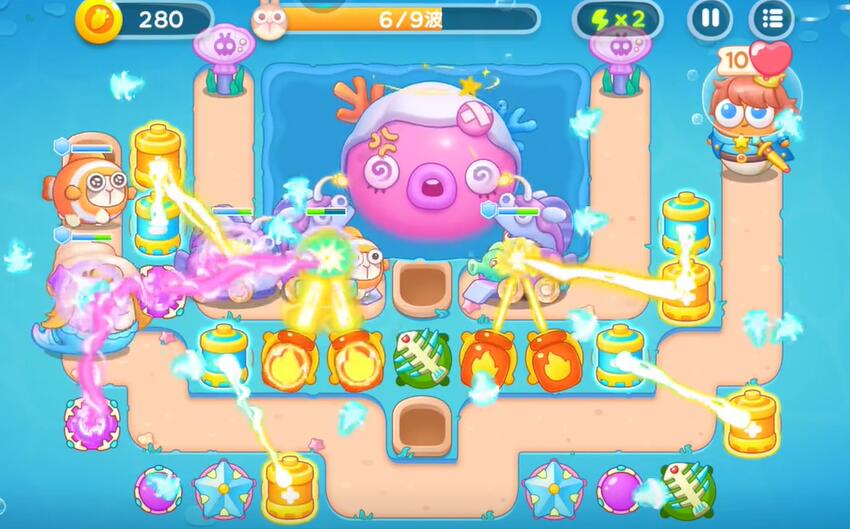 5、在中央建造一个鱼骨,右下角建造一个减速塔对兔子小怪进行攻击。