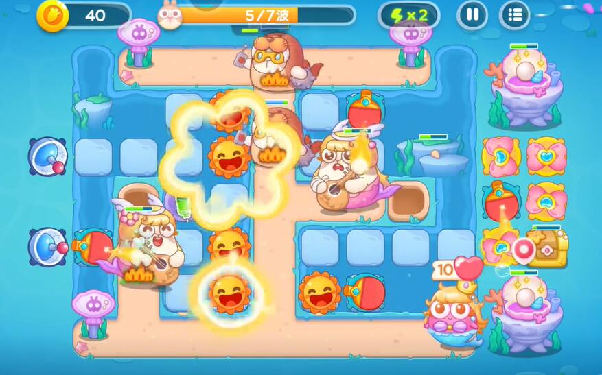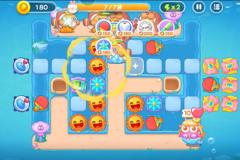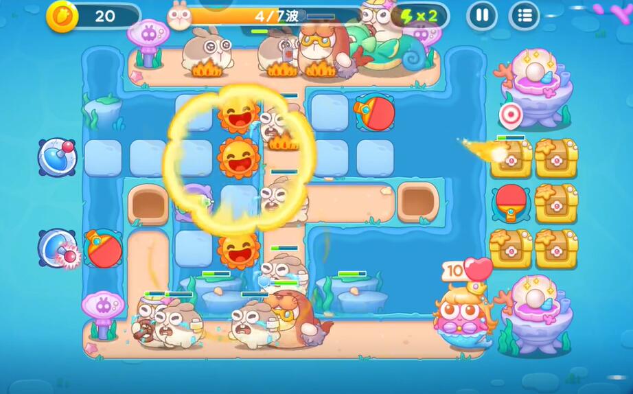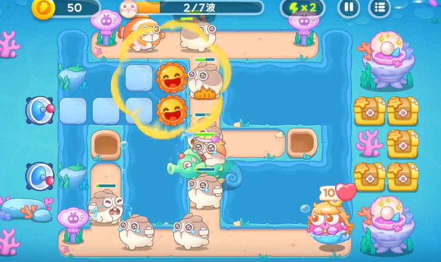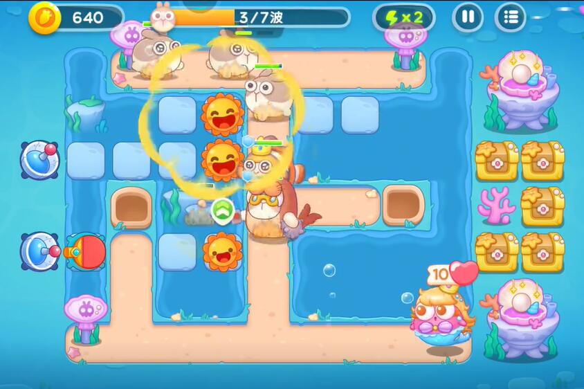 5、在水池中补充向日葵进行攻击,同时利用右侧被摧毁的宝箱获得的蝴蝶结对周边的障碍物进行攻击。