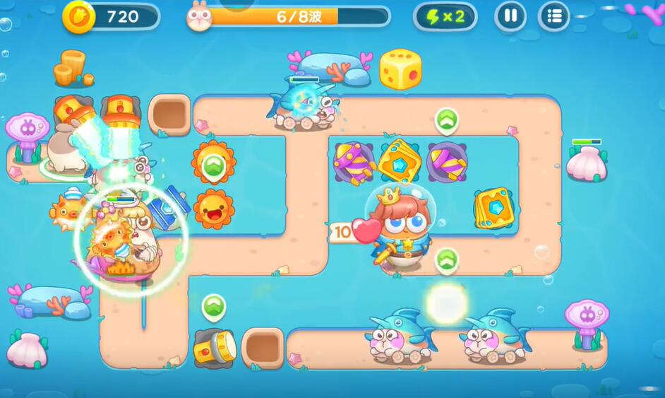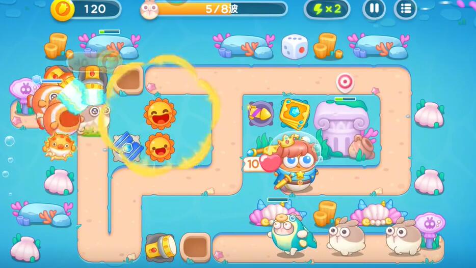 2、在左侧建造一个河豚,河豚的右侧建造一个双向塔,对周边的障碍物进行攻击。