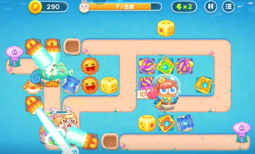 3、摧毁双向塔右侧带来两个宝箱得到向日葵,对兔子进行攻击,在右上方建造一个骰子塔对障碍物进行攻击。