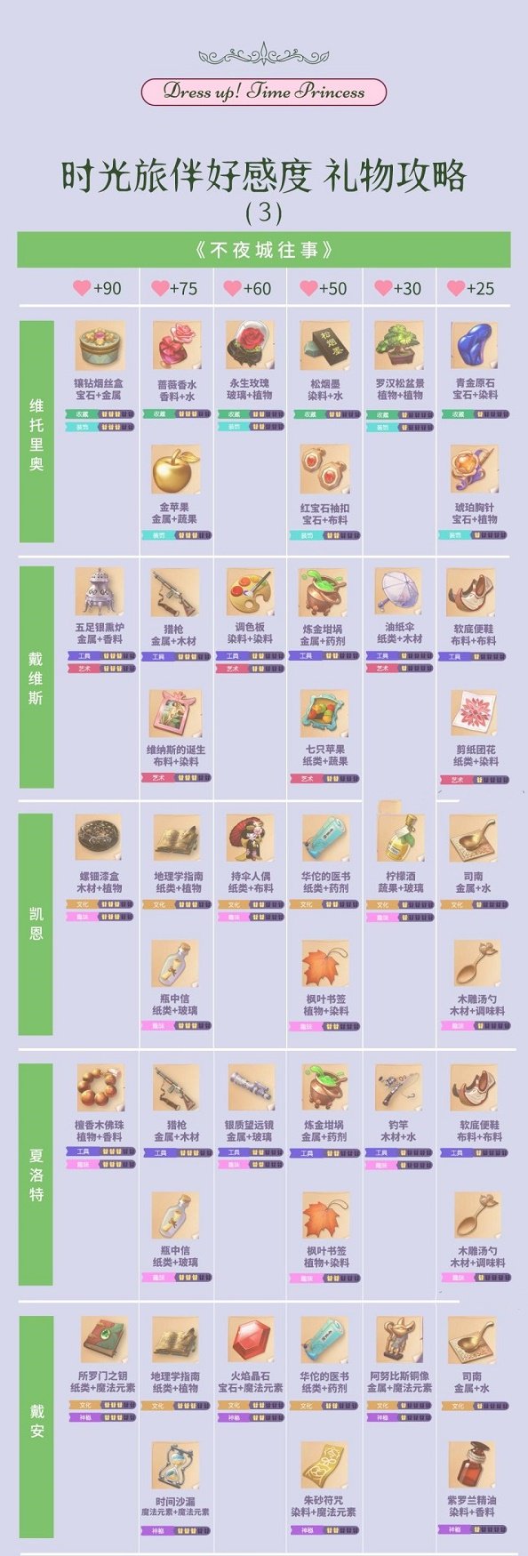时光公主手游需要玩家赠送礼物,才能获取好感度,卡好感是非常难受的,很多人不清楚礼物的具体消耗材料,下面小编给大家带来时光公主礼物制作图,方便大家领取好感奖励,一起看看吧。