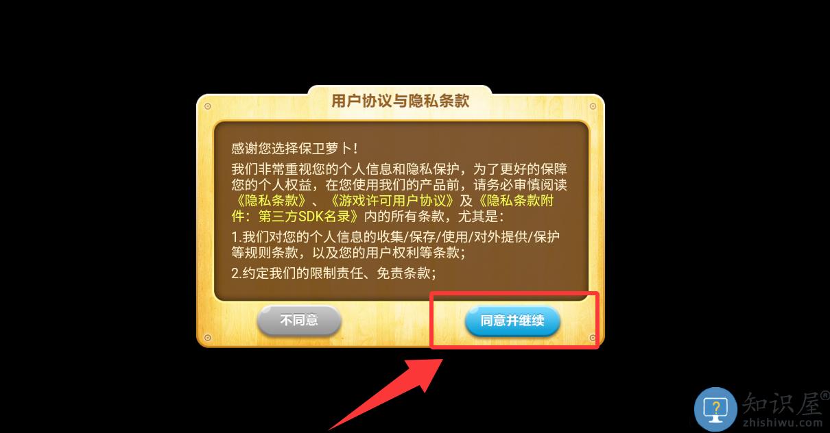 1、点击用户协议与隐私条款里的同意并继续。
