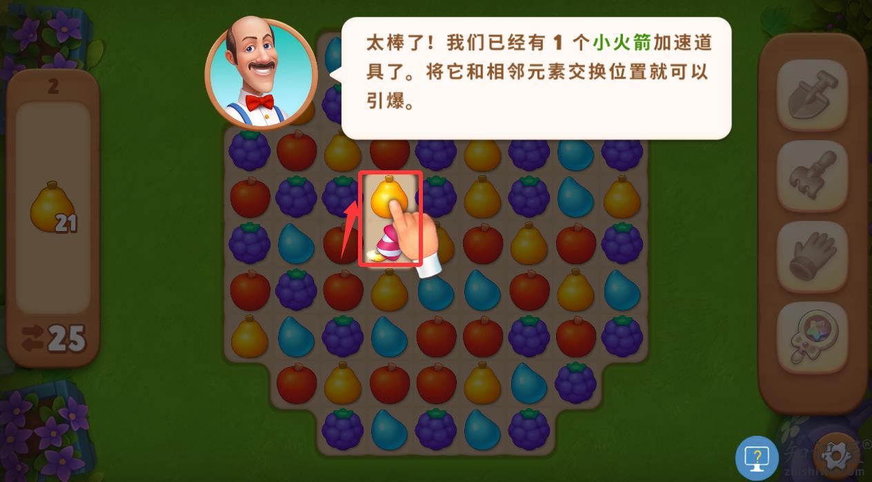 3、把这个火箭和梨对换就可以引爆附近的图案。