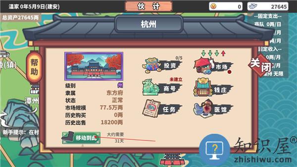 4、点击其他城市选择左下角的移动到此即可花费一定的游戏天数开始移动。来到城市后点击市场去将货物卖掉即可。记住,前期没有令牌是只能在根据地购买货物的,所以将货物卖出去之后,就可以原地解散商队,下一次重新招募即可。