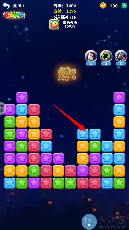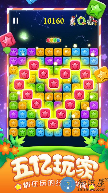 1、进入游戏把相同颜色的星星消灭掉就可以通关了。