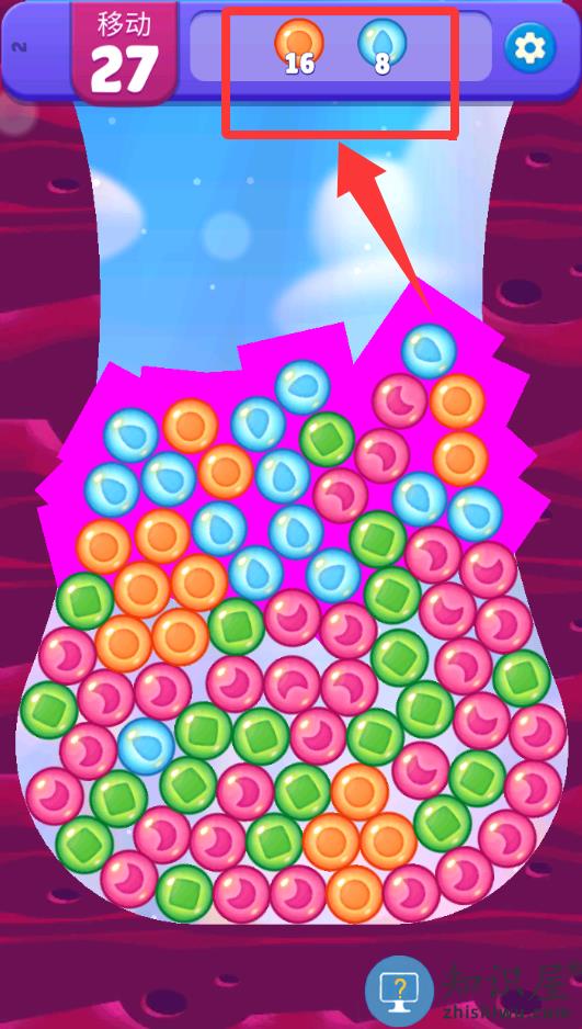 1、进入游戏看中间上面要收集颜色的泡泡就可以通关了。