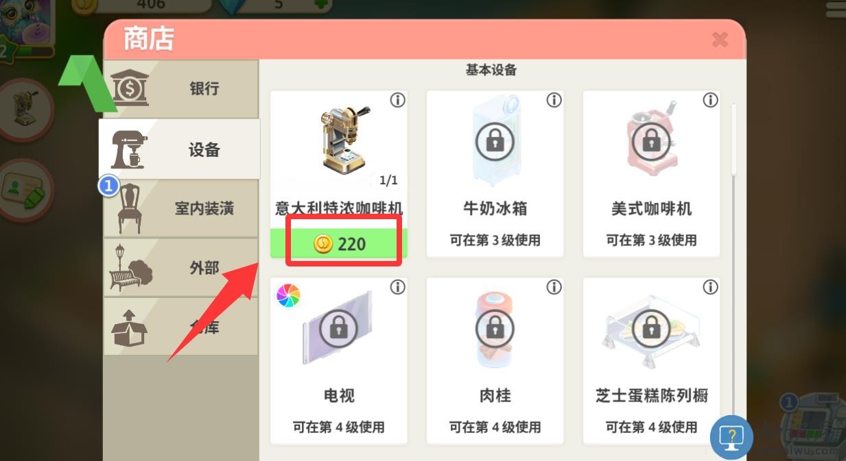 2、花220金币添加一台意大利特浓咖啡机。