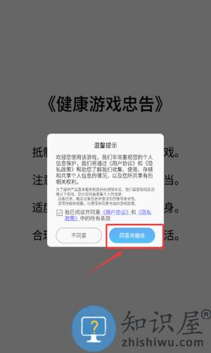1、点击同意并继续按钮,确认用户协议开始游戏。