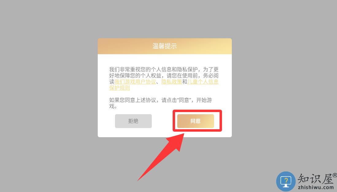 1、点击温馨提示里的同意并进入游戏。