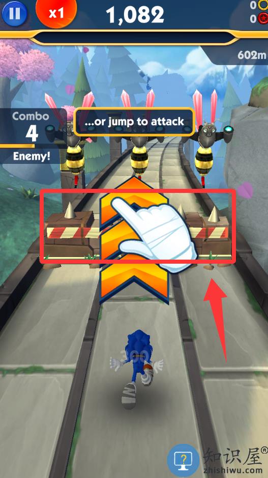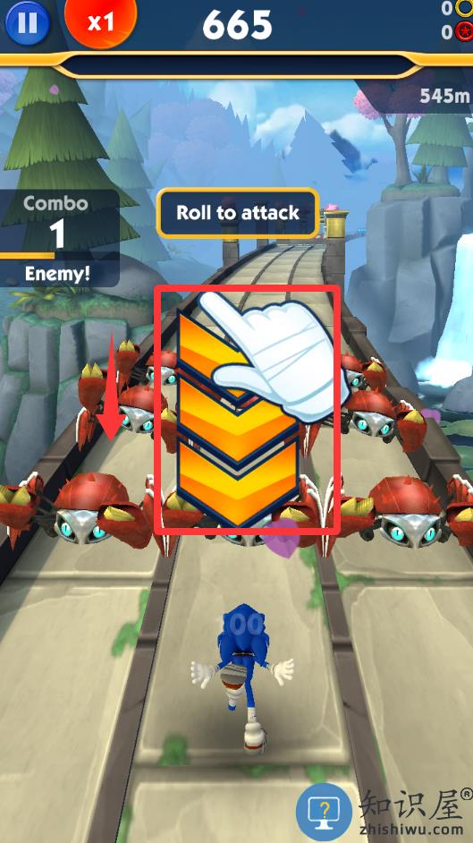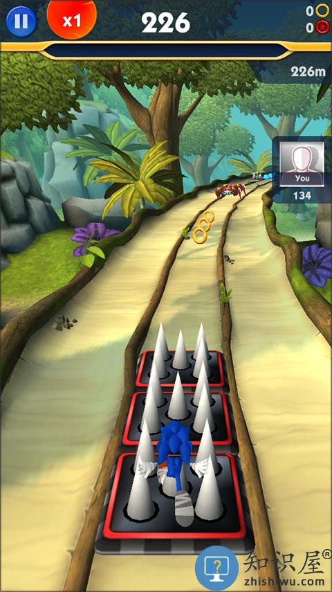 2.游戏中玩家要控制索尼克或者其小伙伴在一条永无止境的三线赛道上进行极速狂奔。通过左右滑动屏幕来让角色左右移动,上下滑动则是跳跃和滚动冲刺,玩过前作的玩家相信很快就能上手。