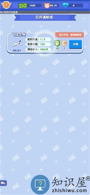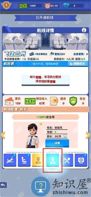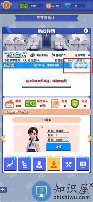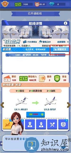 3、都招募好之后,就可以开启第一个航线了。点击【调整班次】,之后点击开启5:00那一班;