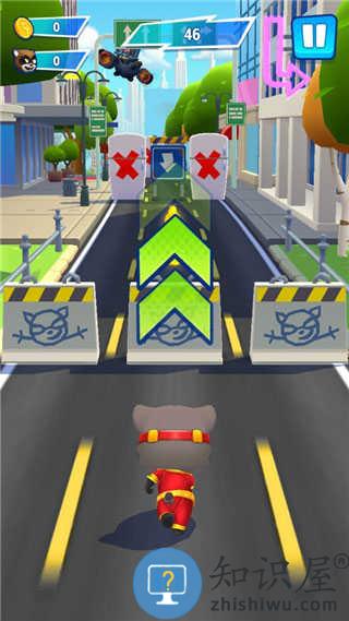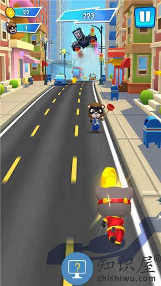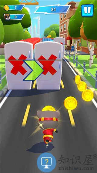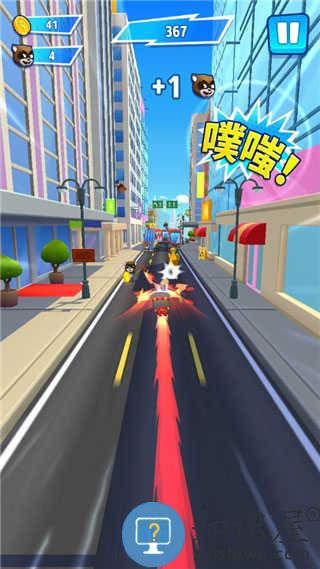 1、操控汤姆猫家族英雄跑酷闯关,在楼顶、龙背等场景躲避障碍,撞击浣熊获取奖励。