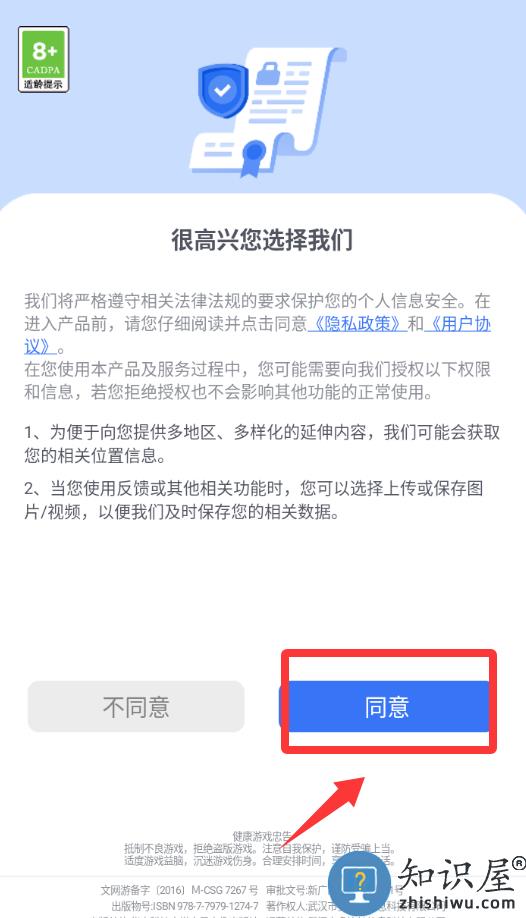 1、点击红色框框里的同意并进入游戏。