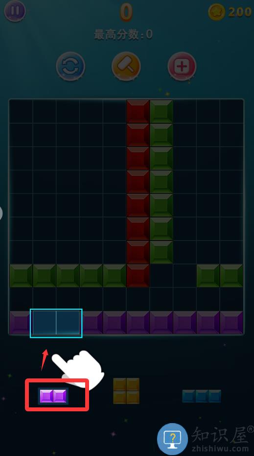 拖动模式:将屏幕下方的三个备选方块拖入宫格中,一行或一列铺满即可消除,直至备选方块无法放置,则消除游戏结束。