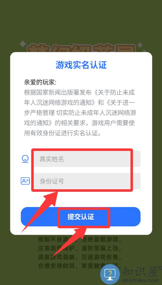 2、进入游戏输入真实姓名和身份证号码并提交。