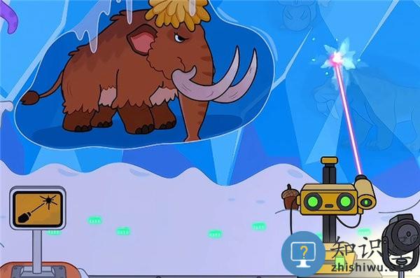 4、例如这里拖动激光将冰块融化,将可以看见长毛象以及小企鹅;