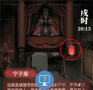 19、根据皮影当中的数字提示还有之前一些书的提示,推出来,点击城隍面左边桌上,点击第二个锁,锁的密码是43618打开之后可以得到纸钱还有小饰品。