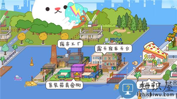 小镇地图从左到右分别对应的是:废弃工厂、露天房车天台、集装箱美食街;