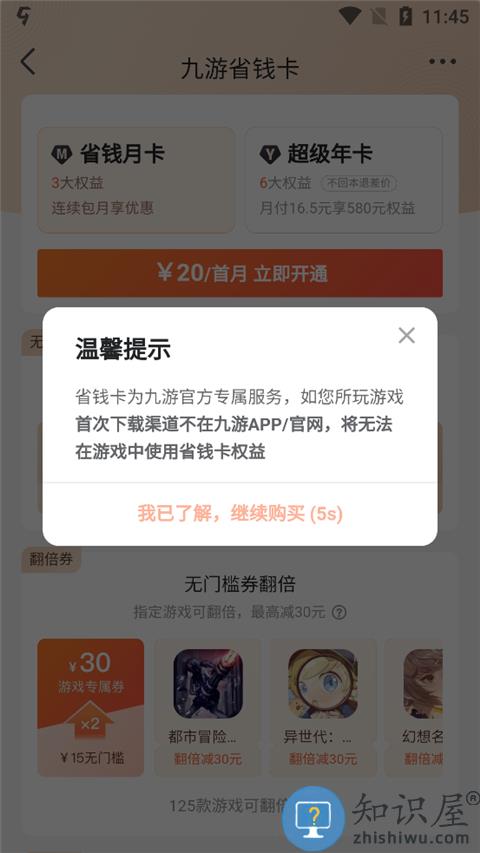 3、点击购买,需要注意的是省钱卡是九游的专属服务,玩家如果所玩游戏首次下载渠道不在九游app上,将无法在游戏兑换游戏券。