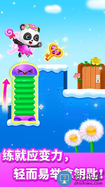 前方道路太高,几何块不够用怎么办?别忘了有特殊装置:放上弹簧,一跃而上。咻,安全到达高处。如何运用道具,考验着宝宝的全局规划哦。