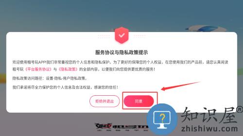 1、阅读服务协议后,点击红框标注的玫红色同意按钮继续。
