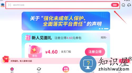 2、在新人见面礼处,点击红框标注的注册立得按钮领取券包。