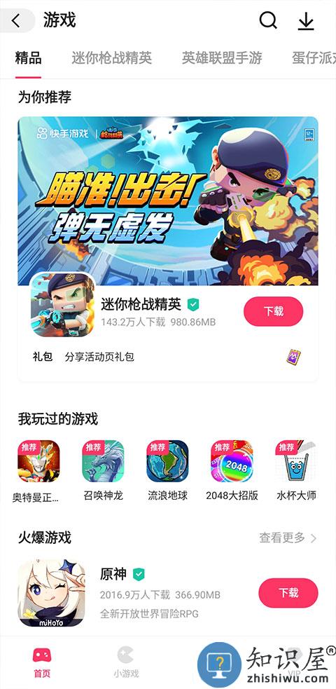 5、进入快手小游戏界面之后,首页可以看到各种热门手游,如下图;