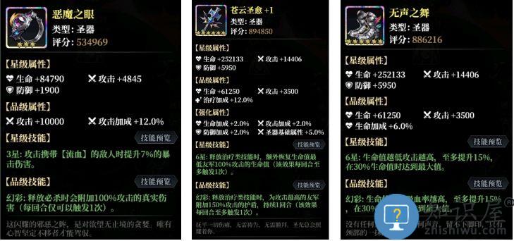 拿改瓦伦丁、特蕾莎、伊莎贝拉来说,这三位最适合的圣器分别是【恶魔之眼】、【苍云圣愈】、【无声之舞】,属性加成如下图所示。然后这个【恶魔之眼】后面也可以给到阿鲁卡多使用。