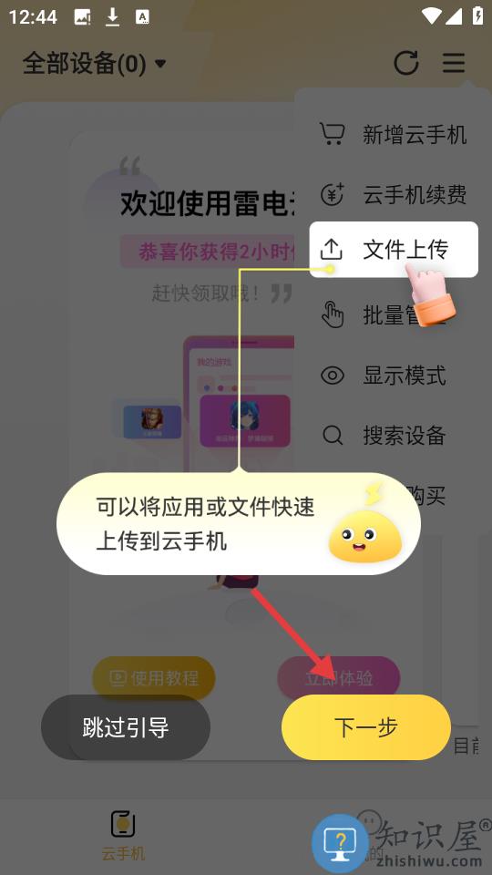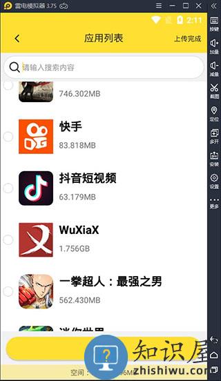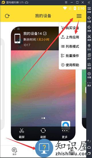 1、在本页面下载安装app,打开云手机后点击右上角菜单——上传应用。