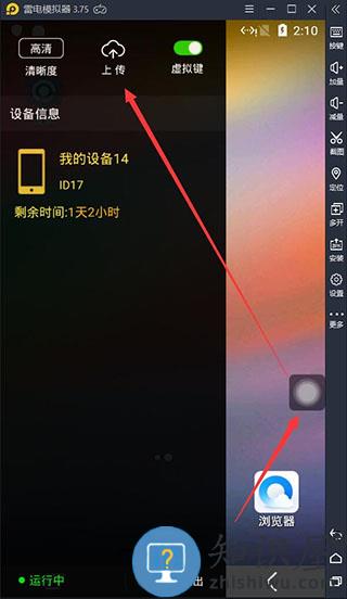 2、进入雷电云手机app——点击悬浮窗——点击左上角上传按钮。