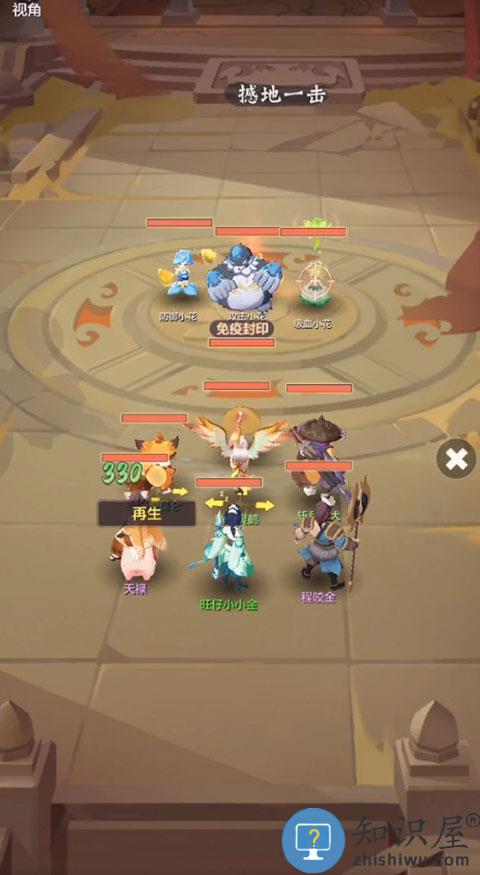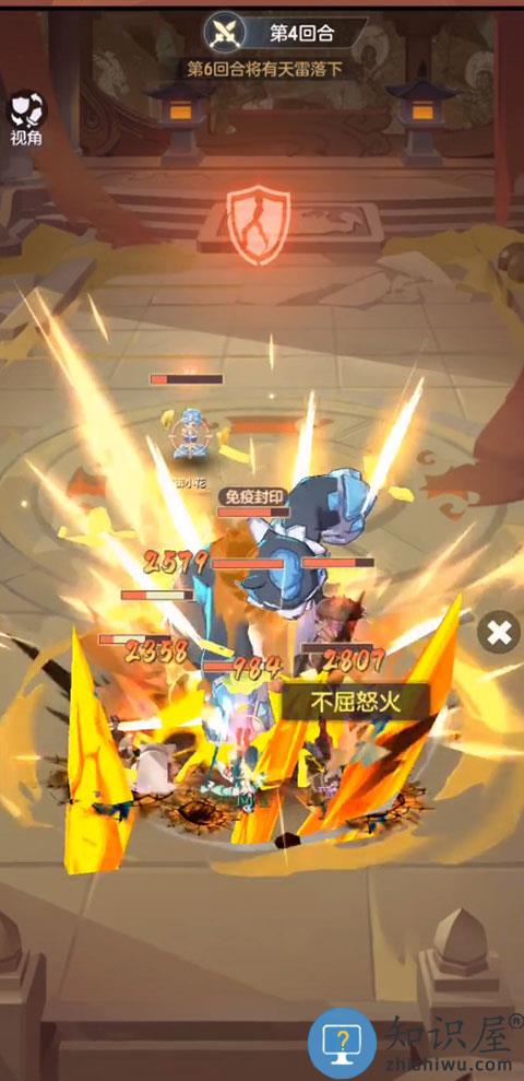 3、第4回合后,前排小花全部清除完毕,专心集火暴食熊,普陀持续为队友恢复血量,避免被第六回合末的天雷直接带走,坚持到最后就可以通关了。