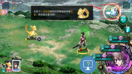 2、根据红框提示,对生命值低的怪兽使用收服功能。