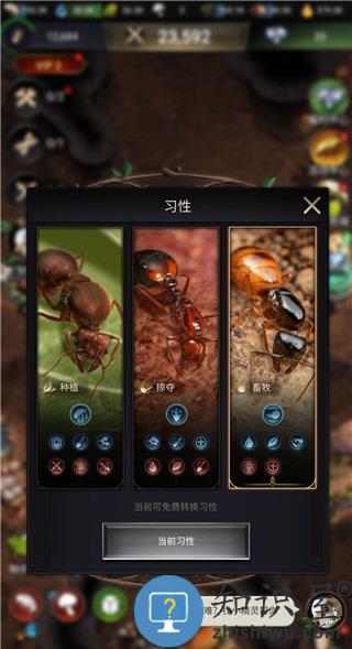 1、种植:游戏中玩家们达到七级之后,就可以进行一次习性自行选择,所选的习性将会影响今后的发展方向,三天之后可以免费更换一次,期间无法更换。种植这个习性是比较偏向于发展的,每次在晚上被偷袭的时候,可以保证资源有所保障,不被完全掠夺走,而且工蚁干活速度,采集速度以及负重都会额外增加一倍左右。当然也是有负面效果的,就是打仗用的军队兵蚁战斗力会大打折扣,防御力也会大打折扣。而且在战斗的时候,行军速度也会变慢,这是为了让各位玩家在前期快速发育时用的,前期玩家们一般都会有系统的新手保护,这个时候不用担心会被掠夺。