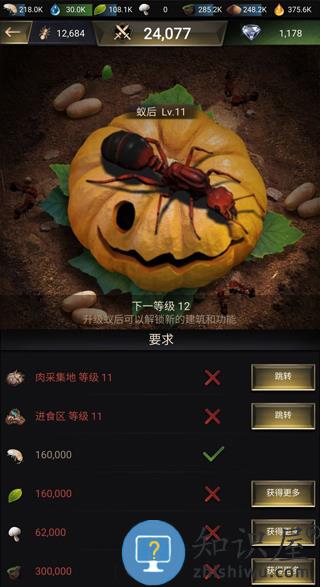 蚁巢地区限制条件:想要探索除去自己等级之外的更多蚁巢位置,就必须将蚁后的等级提升,而蚁后想要提升等级,就转化成了各种资源的获取以及仓库储存限制。这两个条件是相互转换的,说白了,想解锁更多的区域,你就得有这么多的物资。而新手引导结束之后,玩家们的主要目标也应该变成想法提高蚁后的等级,这样主要任务就转化成为尽可能多的在游戏中获取肉,水,植物,沙子,蜜露等种种资源。