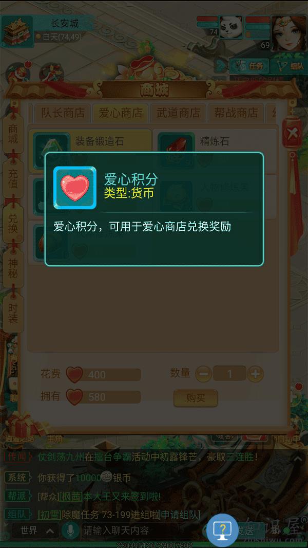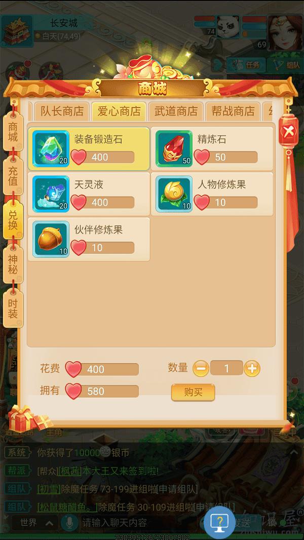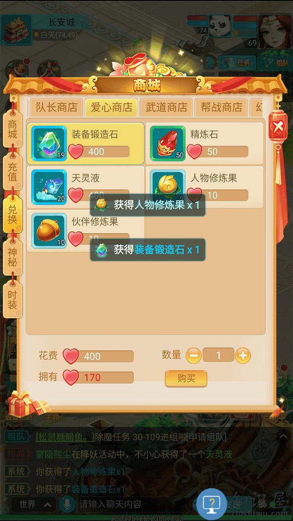 说了这么多爱心积分的来源,那么它到底能换些什么呢?这我们就要去爱心商店里看看了。爱心商店可以在商城的兑换里找到,在这里你可以兑换到锻造石、精炼石、天灵液和修炼果等实用道具。