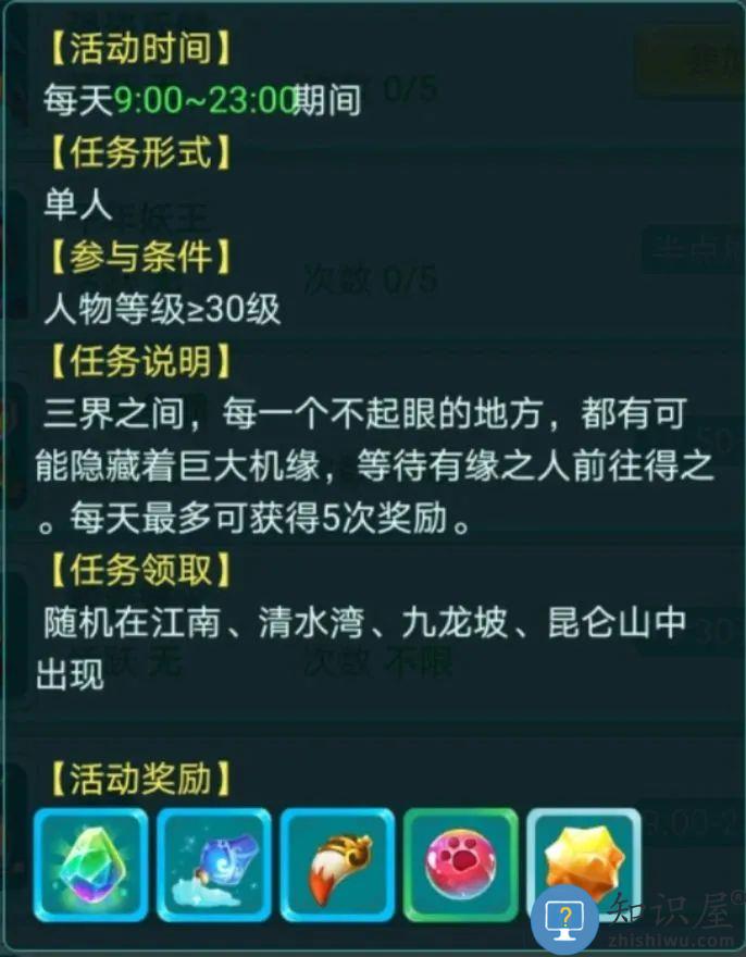 在三界每一个不起眼的地方,都可能藏着巨大的机缘,少侠遇见这些机缘千万不要放过,接取仙缘并完成,你也能获得大量的经验,每天可接取5次仙缘