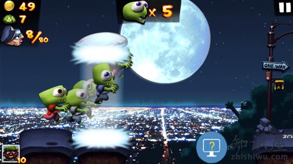 在僵尸尖叫中,玩家不需要控制僵尸的左右移动,玩家可以点击屏幕,让僵尸跳起来,当玩家单击一下则僵尸会跳跃起来,当用户长按屏幕,僵尸便会在跳跃到一定高度后,以一种滑行的姿态在空中滑翔一段路程。