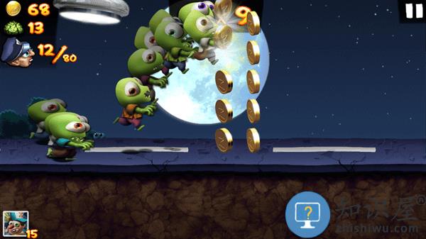 道具:跑的过程中会有一个类似于,箱子的东西,跳起来碰到他,就会随机给你一个道具。道具的种类貌似有波浪(超爱)UFO(隔段时间来个僵尸)小金人(碰到的障碍都会变成金币)橄榄球员(铁头功2333)忍者(跳的贼高,可以把障碍切开)大头僵尸(僵尸会全部飘到上方。长摁屏幕下降)等等等等