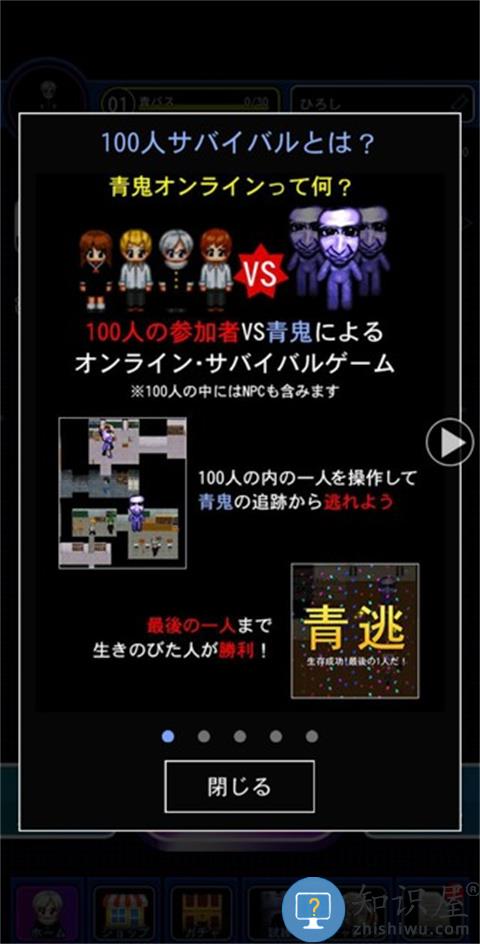 100名参与者和青鬼在线生成(其中100名也包括NPC),玩家控制100人当中的其中一个,逃离青鬼的追踪,直到最后一个获胜,