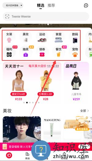 3、首页分类展示女装、美妆、运动、家居、数码产品及抽奖领券活动。