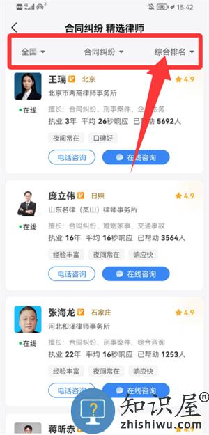2、通过地区与领域筛选,查看符合需求的律师信息。