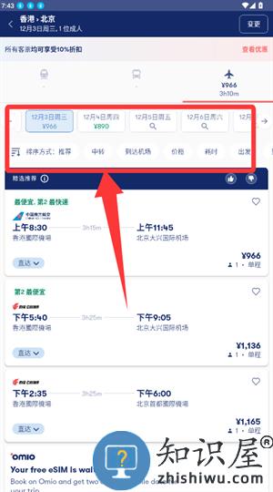 2、切换日期或按价格排序,筛选适合的车次航班。