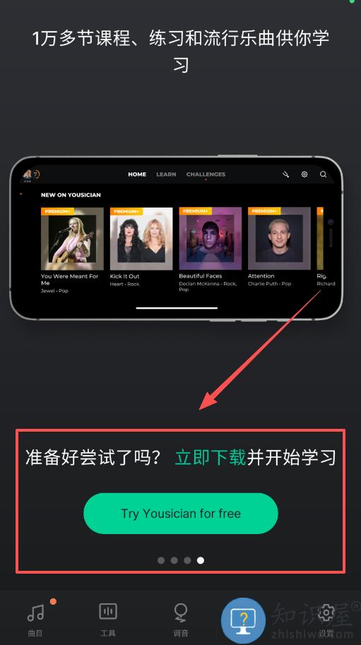 1、打开软件就能看到主页介绍有1万多节课程、练习和流行乐曲可以学,直接点那个"免费试用"按钮就能开始.