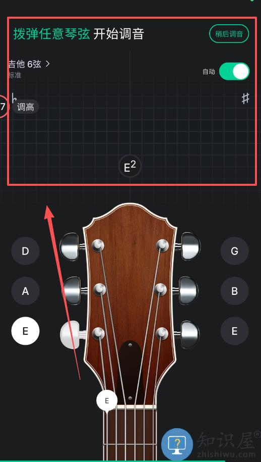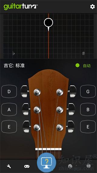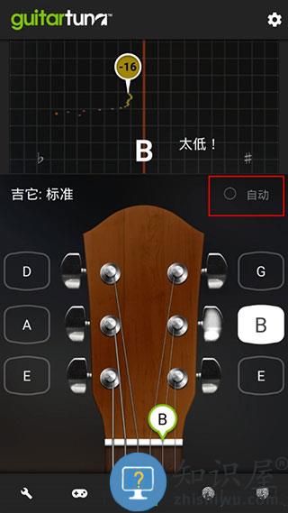 1、软件上默认是自动吉他调音,拨动琴弦软件会显示对应的弦和音准,不断调整使标尺位于中间并全绿通过就表示调准了